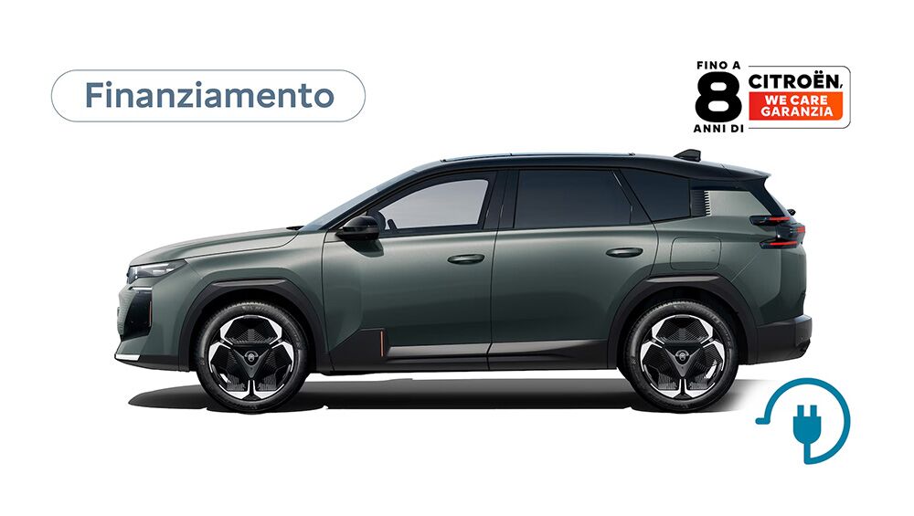 DETTAGLIO PROMOZIONE Es. di leasing finanziario suNUOVO SUV C5 AIRCROSS YOU Elettrico 210 cv Automatico: Prezzo di Listino (IPT e contributo PFU esclusi) 37.690 €. Prezzo Promo 36.400 € (oppure 35.900 con leasing finanziario SimplyDrive Leasing Promo Valore fornitura 35.900 €). Primo canone anticipato 10.670 €, durata 36 mesi; 35 canoni mensili da 249 € (incluse spese di gestione di 15 €/canone ed il servizio Identicar 12 mesi per un importo mensile del servizio di 7,53 € e comprensivo della wallbox per un importo mensile di 13,86€). Valore di riscatto 22.638 €. Importo Totale del Credito 25.230 €. Spese Istruttoria 0 €. Bollo 16 €. Spese invio rendiconto periodico cartaceo: 0 €/anno. Interessi totali 3.319 €. Importo Totale Dovuto 39.219 € (escluso anticipo e comprensivo dell’eventuale Valore di Riscatto). Solo in caso di restituzione e/o sostituzione del veicolo alla scadenza contrattualmente prevista, verrà addebitato un costo pari a 0,06 €/km ove il veicolo abbia superato il chilometraggio massimo di 30.000 km. TAN (fisso) 5,49%, TAEG 6,83%. Tutti gli importi sono comprensivi di IVA, ove prevista. Offerta valida su clientela privata in caso di permuta o rottamazione fino al 31 dicembre 2025, non cumulabile con altre iniziative in corso. Offerta Stellantis Financial Services Italia S.p.A. soggetta ad approvazione. Documentazione precontrattuale bancaria/assicurativa in concessionaria e sul sito www.stellantis-financial-services.it (Sez. Trasparenza). Messaggio Pubblicitario con finalità promozionale.