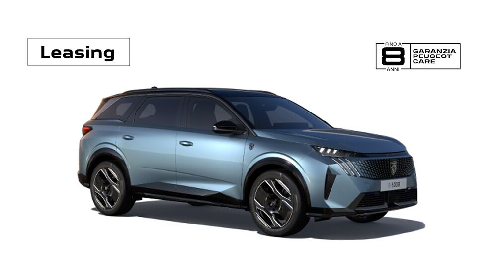 DETTAGLIO PROMOZIONE Es. di leasing finanziario PEUGEOT EGO su Nuova E-5008 GT EXCLUSIVE 325 cv – Dual Motor: Prezzo di Listino (IPT e contributo PFU esclusi) 57.630 €. Prezzo Promo 52.830 € Valore fornitura 52.830 €. Primo canone anticipato 8.530 €, durata 36 mesi; 35 canoni mensili da 499 € (incluse spese di gestione di 15 €/canone il servizio Identicar 12 mesi per un importo mensile del servizio di 7,53 € e comprensivo della wallbox per un importo mensile di 13,86€). Valore di riscatto 32.535 €. Importo Totale del Credito 44.300 €. Spese Istruttoria 0 €. Bollo 16 €. Spese invio rendiconto periodico cartaceo: 0 €/anno. Interessi totali 2.880 €. Importo Totale Dovuto 55.710 € (escluso anticipo e comprensivo dell’eventuale Valore di Riscatto). Solo in caso di restituzione e/o sostituzione del veicolo alla scadenza contrattualmente prevista, verrà addebitato un costo pari a 0,06 €/km ove il veicolo abbia superato il chilometraggio massimo di 45.000 km. TAN (fisso) 2,99%, TAEG 3,76%. Tutti gli importi sono comprensivi di IVA, ove prevista. Offerta valida su clientela privata fino al 31 Dicembre 2025 non cumulabile con altre iniziative in corso. Offerta Stellantis Financial Services Italia S.p.A. soggetta ad approvazione. Documentazione precontrattuale bancaria/assicurativa in concessionaria e sul sito www.stellantis-financial-services.it (Sez. Trasparenza). Messaggio Pubblicitario con finalità promozionale.