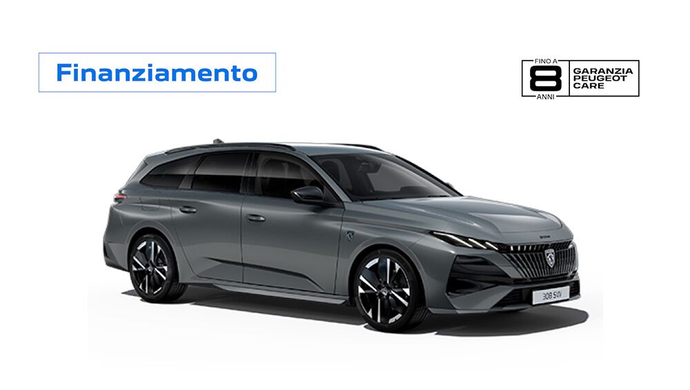 DETTAGLIO PROMOZIONE. Es di finanziamento I Move Promo su Peugeot 308 SW Bluehdi 130 S&S EAT8 Allure: Prezzo Listino (IVA e messa su strada incluse, IPT, kit sicurezza + contributo PFU e bollo su dichiarazione di conformità esclusi) 37.020 €. Prezzo Promo 32.720 € per vetture in pronta consegna. Anticipo 7.828 € – Importo Totale del Credito 24.892 €. L’offerta include il servizio Identicar 12 mesi di 271€. Importo Totale Dovuto 29.544,74 € composto da: Importo Totale del Credito, spese di istruttoria 395 €, Interessi 3.796,67 €, spese di incasso mensili 3,5 €, imposta sostitutiva sul contratto da addebitare sulla prima rata di 63,9 €. Tale importo è da restituirsi in n° 36 rate come segue: n° 35 rate da 199 € comprensive del servizio Extended Care Premium (2 anni di garanzia contrattuale più 1 anno di estensione con limite di 45.000 km al costo di 4,75 € mensili) e una Rata Finale Residua (pari al Valore Garantito Futuro) 22.682 € incluse spese di incasso mensili di 3,5 €. Spese invio rendiconto periodico cartaceo: 0 € /anno. TAN (fisso) 5,25%, TAEG 6,73%. Solo in caso di restituzione e/o sostituzione del veicolo alla scadenza contrattualmente prevista, verrà addebitato un costo pari a 0,1 €/ km ove il veicolo abbia superato il chilometraggio massimo di 45.000 km. Offerta valida solo su clientela privata solo per contratti stipulati fino al 31 Dicembre 2025, non cumulabile con altre iniziative in corso. Offerta Stellantis Financial Services Italia S.p.A. soggetta ad approvazione. Documentazione precontrattuale bancaria/assicurativa in concessionaria e sul sito www.stellantis-financial-services.it (Sez. Trasparenza). Messaggio Pubblicitario con finalità promozionale.